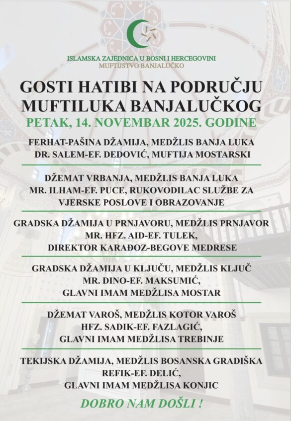 U petak 14. novembra 2025. godine u posjeti Muftijstvu banjalučkom boravit će delegacija Muftijstva mostarskog predvođena dr. Salemom-ef. Dedovićem, muftijom mostarskim. Prema Planu posjete članovi delegacije će između ostalog biti hatibi u određenim medžlisima na području Muftiluka banjalučkog, gdje će uputiti poruke prisutnima vjernicima i...