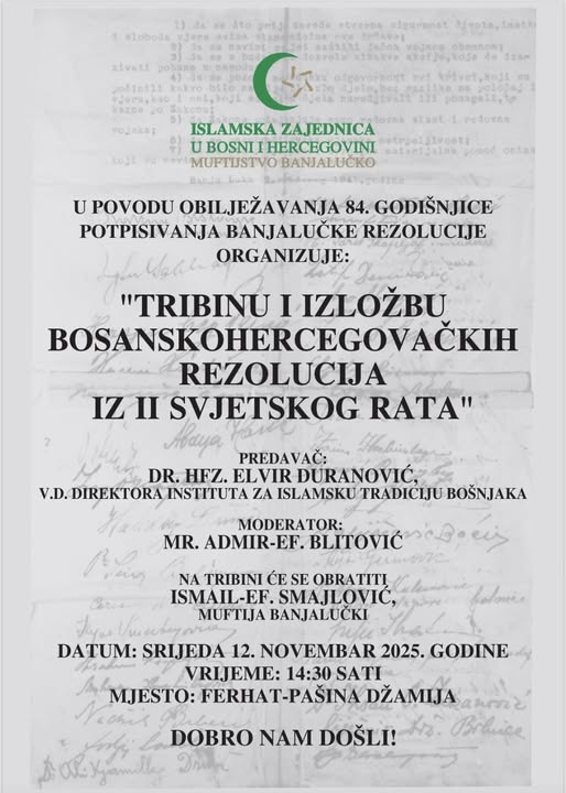 U povodu obilježavanja 84. godišnjice potpisivanja Banjalučke rezolucije, u Ferhat-pašinoj džamiji sinoć je održana tribina i izložba bosanskohercegovačkih rezolucija iz Drugog svjetskog rata. Muftija banjalučki Ismail-ef. Smajlović izjavio je da Banjalučka rezolucija šalje mnogo poruka, ali su dvije najznačajnije. – Jedna govori o svijesti banjalučkih muslimana...